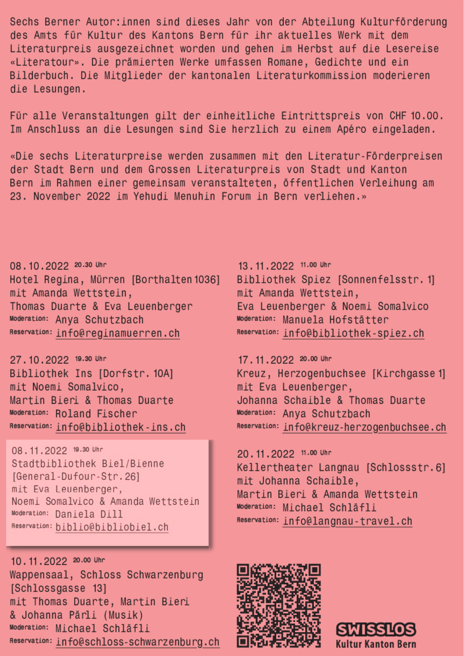 Les manifestations seront présentées par des membres de la commission de littérature germanophone du canton de Berne.