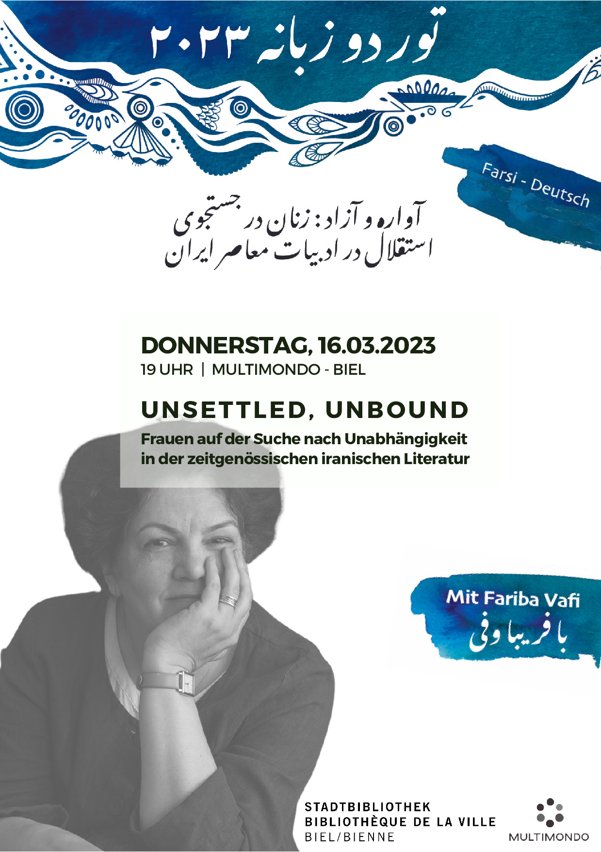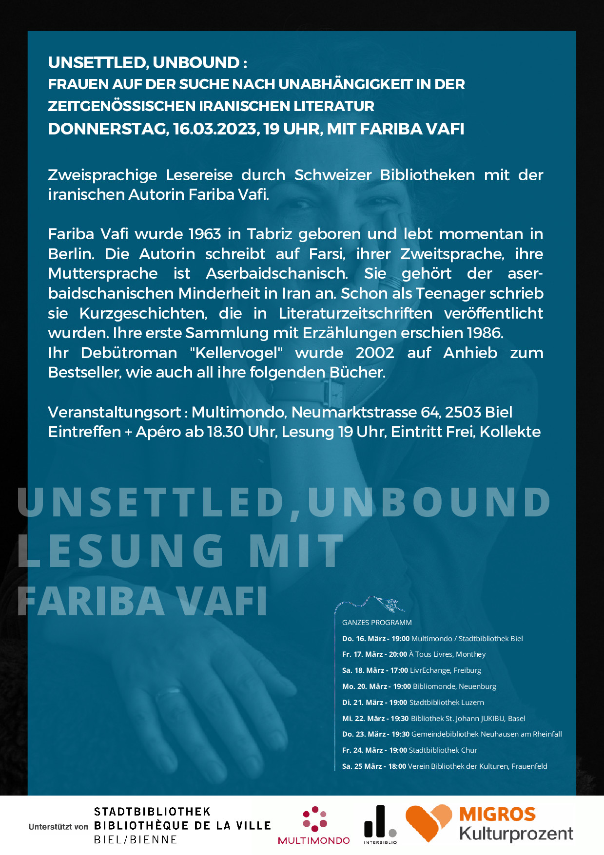Zweisprachige Lesung der iranischen Autorin Faribā Vafī in der mehrsprachigen Bibliothek LibriMondo,. Neumarktstrasse 64,in Biel. Sprachen: Farsi und Deutsch
